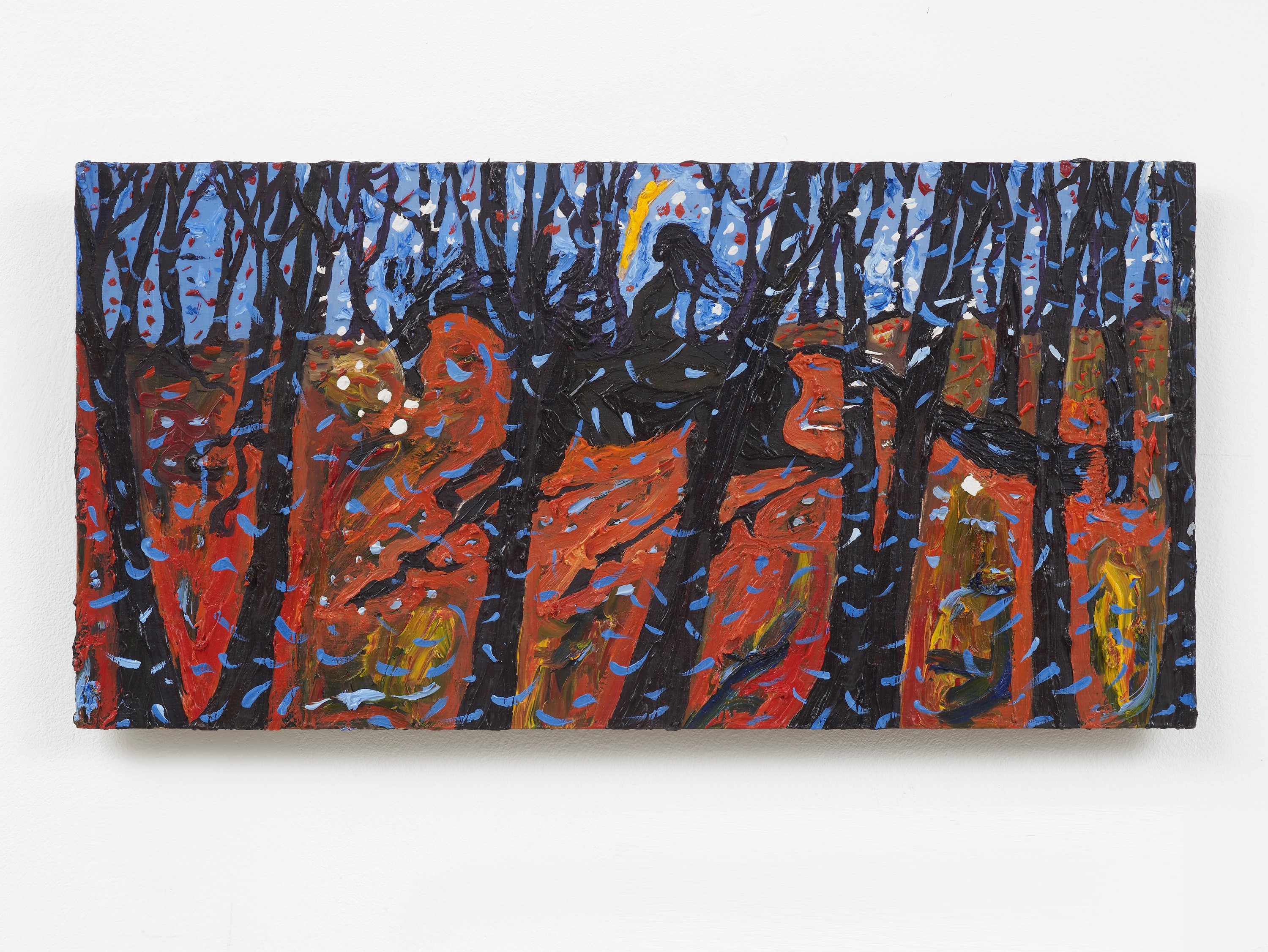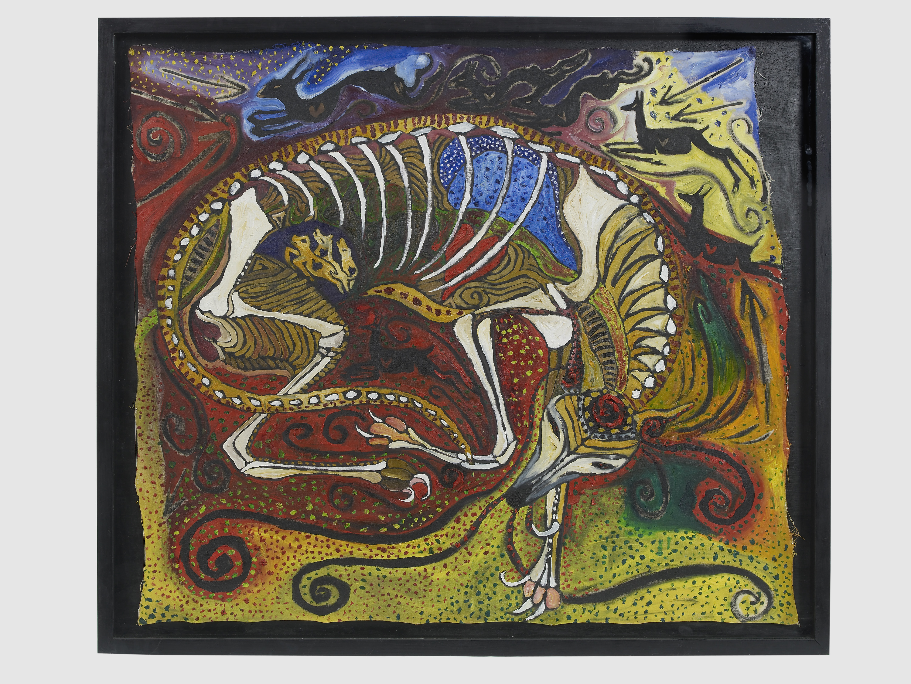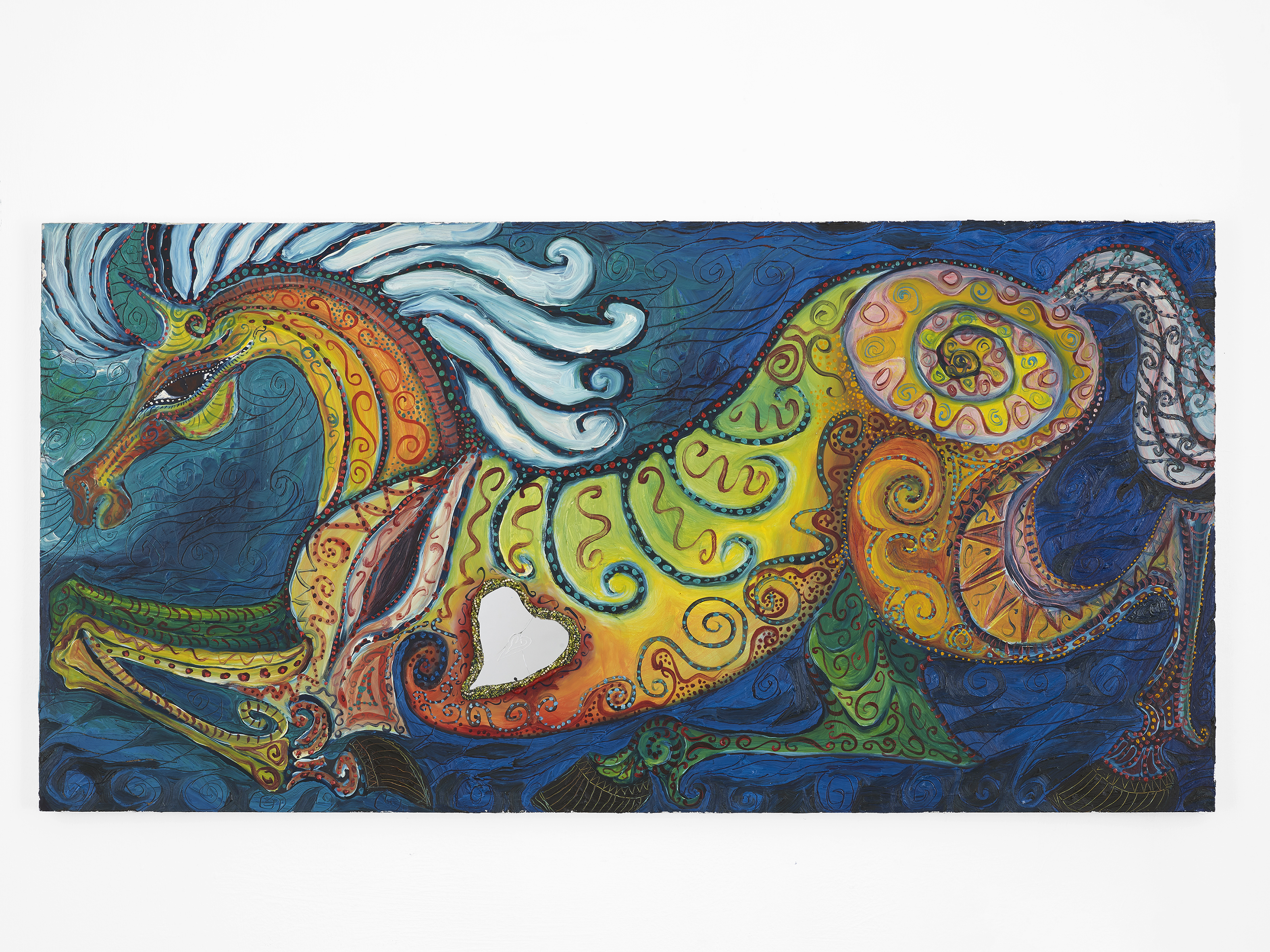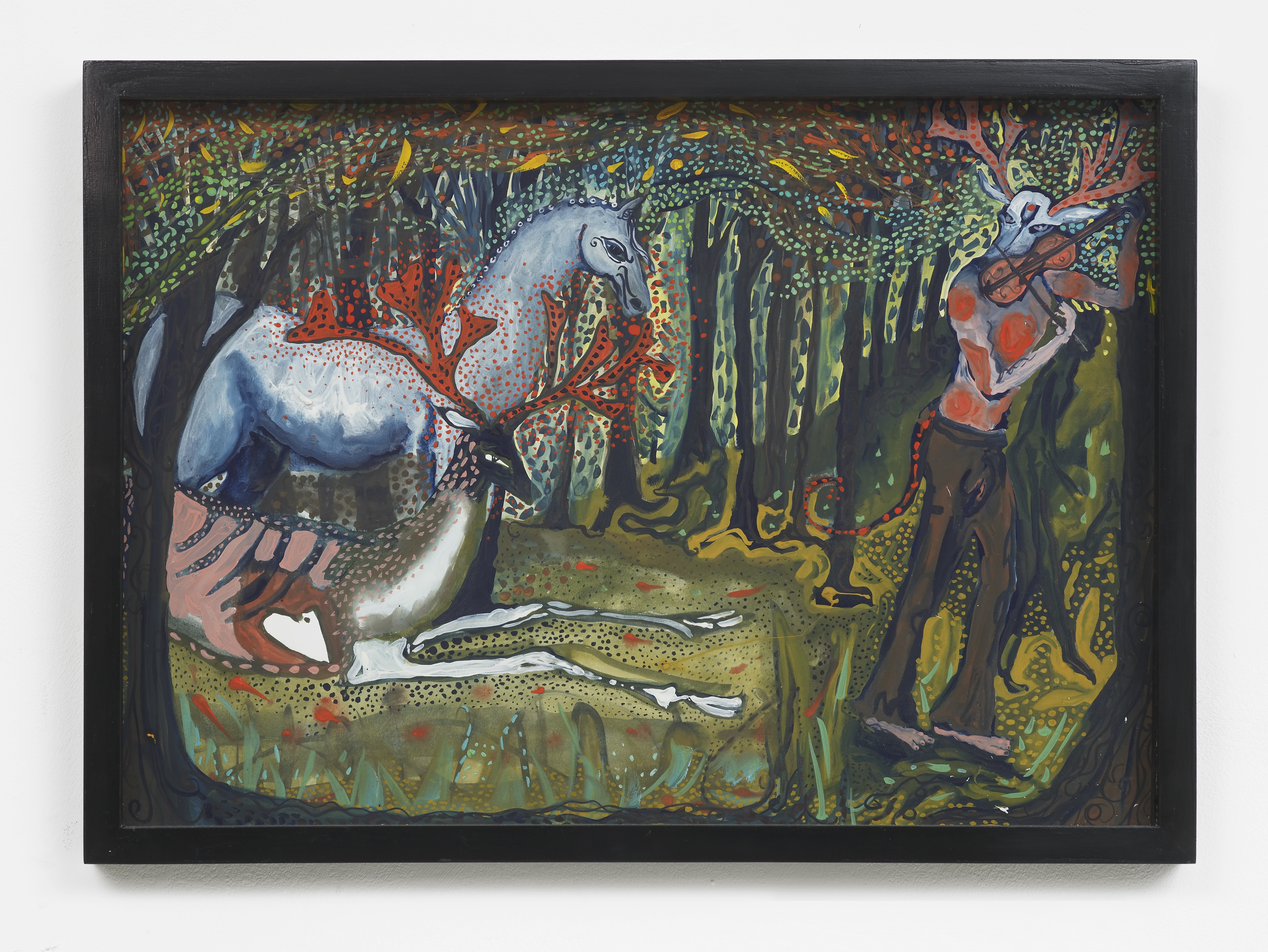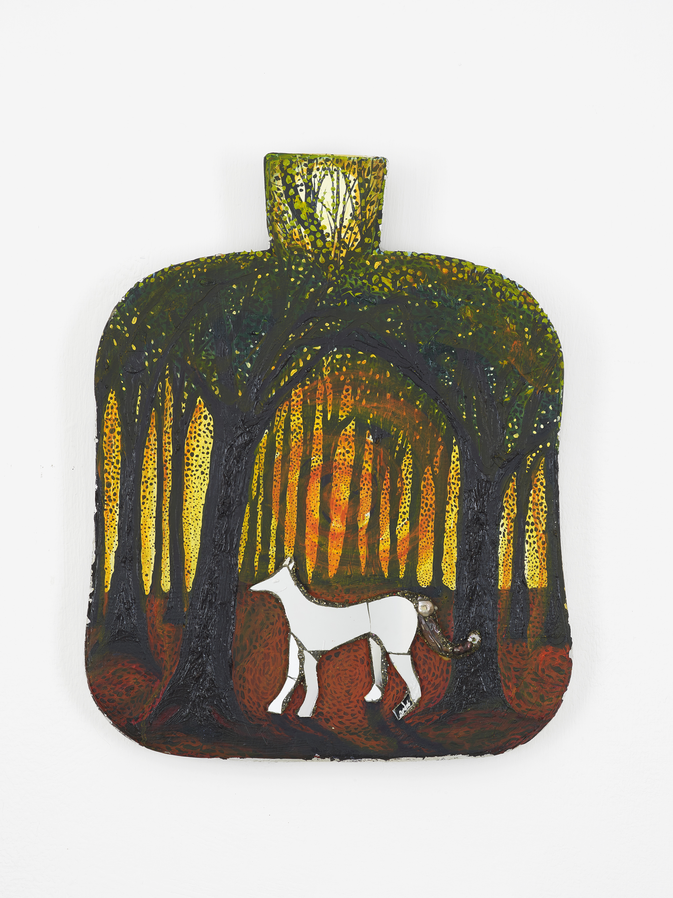 2000s paintings ‘Unicorn’ 2019, oil on board with Andrew Logan mirrorwork, 61 X 82cms ‘Heart’, 2019, oil on board with Andrew Logan mirrorwork, 61 X 122cms ‘Hound’ 2019, oil painted chair seat ‘Star’ 2019, oil on board with Andrew Logan mirrorwork, 82 X 61cms ‘Pegasus’ banner 2019, oil on canvas with gold leaf and branch, 150 X 100cms approx ‘Girl and Unicorn Dancing’ 2019, oil on board with andrew Logan mirrorwork, 122 X 61 cms ‘Tree of Life’ 2019, oil painted door with Andrew Logan mirrorwork, 50 X 145cms ‘The Neo naturist Ladies Choir’ 2019, oil on canvas, 149 X 189cms ‘The Neo naturists at Studio Voltaire’ 2018, oil on canvas, 95 X 150cms ‘Mudslags’ 2018, oil on canvas, 150 X 100cms ‘Dreaming of an Abandoned House’, oil on canvas, 2017, 120 X 180cms ‘Deer’ 2017 oil on canvas with branch, 123 X 81cms ‘Self Portrait with Animals’ 2017, oil on canvas with branch, 117 X 181cms ‘Meeting a Horse on The Otherside’ 2016 oil painted door, 179 X 78cms ‘A Fairy Tale’ and ‘The Poet Dreams’ 2016 oil painted wooden doors with metal hinges, 47 X 164 cms each ‘Woman in The Woods’ 2016 oil on wood 20.5 X 40.5cms ‘Rider’, 2016 oil on wood, 14 X 17cms ‘A Walk’, 2016 oil on wood, 14 X 17cms ‘Andy and Sandy’ 2016, painted screen, 173 X 99cms 5 Fetishes, 2016, oil paint on wooden chair seats and oddments with nails ‘St. George’s Day Banner’, 2015, oil on canvas with branch, 110 X 158cms ‘Tall Trees 2’, 2015, oil on board, 38 X 123cms ‘Lady and Unicorn in The Shadow’, 2015 oil on canvas with branch, 58 X 123cms ‘White Unicorn by The Shard’, 2015, oil on board, 46 X 123cms Deer in The Snow, 2015, oil on board, 30 X 46cms Rain, 2015, oil on wood, 14 X 17cms Animals Under a Black Moon, 2013, oil on board, 48 X 25cms Fox Woman, 2013, oil on board, 180 x 61 cms ‘Fiddle Player with Animals 1’ 2013, goauche on paper, 41 X 59cms ‘Fiddle Player with Animals 2’ 2013 gouache on paper, 41 x 59cms ‘Passion’, 2013 oil on board, 43 X 42cms ‘Fiddle Player with Deer’, 2013, oil on board, 180 x 61cms ‘Alone’, 2012, oil on board, 25 X 47cms Hunted Stag, 2008, oil on canvas, 113 X 145cms The Hunt, 2008, oil on paper, 37 x 77cms ‘Hunt in The Forest’ oil on canvas, 2008 8′ X 4′ ‘Amy Dreams’ oil on canvas, 2007, 146 X 126cms ‘Feral Children’ 2006, oil on canvas with newspaper, 122 x 180 cms ‘A Little Hut in The Woods’ 2006, oil on board, 96 x 127cms ‘The Little Brother and Sister, 2006, oil on canvas, 122 x 183cms approx ‘The Iron Stove’ 2006 oil and chalk on board, 122 x 183cms ‘The 3 Snake Leaves’ 2006 oil on board with chalk, 183 X 122 cms ‘Maypole Dancing in Jevington’ 2004 acrylic on canvas with branch, 107 x 152 cms approx